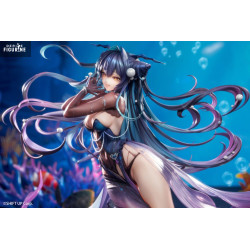 The figure depicts her in a graceful and alluring pose, as if carried by ocean currents. She wears a dark outfit contrasted by a long translucent veil in shades of purple, flowing around her to enhance the sense of motion. Her long black hair with purple tips floats freely, adding lightness and dynamism to the sculpt.