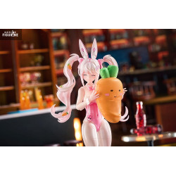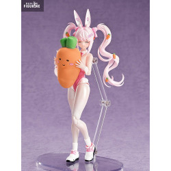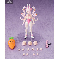 The figure perfectly captures her wild design: a glossy pink bodysuit with a bowtie and tiny bunny emblem on her hip. She sports bunny ears, chunky sneakers, and massive twin tails decorated with mini carrots. Her expressions change with the included faceplates — from playful smirk to focused or serious gaze.