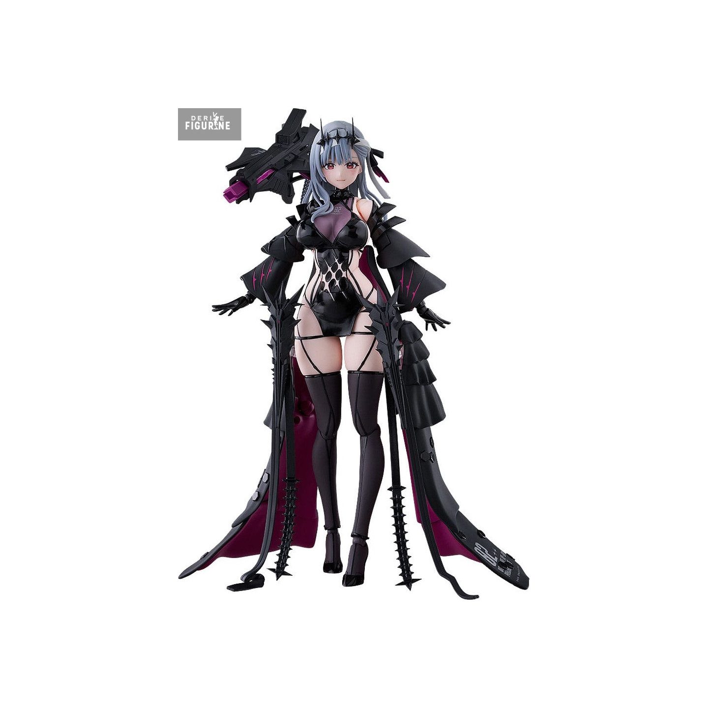 This figure from the Figma line accurately reproduces her look: a sleek black outfit with detailed textures, semi-transparent stockings, reinforced gloves, and massive mechanical weaponry attached to her back. Horn-like accents on her head and silver, wavy hair enhance her elegant yet intimidating presence. The inner lining of her cape features a deep violet shade for dramatic contrast.