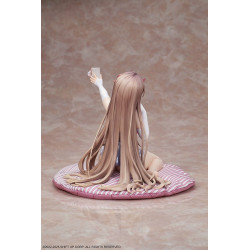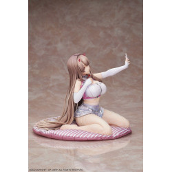 The sculpt emphasizes a relaxed but detailed outfit: Viper wears a fitted white top with pink straps that follow the lines of her body, paired with short, softly shimmering mauve-colored shorts. Her long brown hair flows down her back and across the cushion, with a few strands pulled forward and decorated with small pink accessories near her fringe. She kneels on a wide pink-and-white striped cushion that works both as a cozy setting and as a stable display base. The slim smartphone, the ribbons, the folds of the fabric and the natural motion in her hair all contribute to a lively, expressive piece that fits perfectly in a Nikke or mobile game heroine collection.