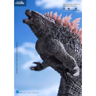 This figurine is part of the Exquisite Stylist collection from Hiya Toys, known for its exceptional finishes and attention to detail. The meticulous sculpting perfectly captures the essence of Godzilla in his evolved form, with impressive detail on his skin texture and fearsome backbones. The latter, in a bright pink, contrast beautifully with the dark tones of the body, creating a striking visual effect.