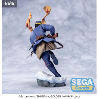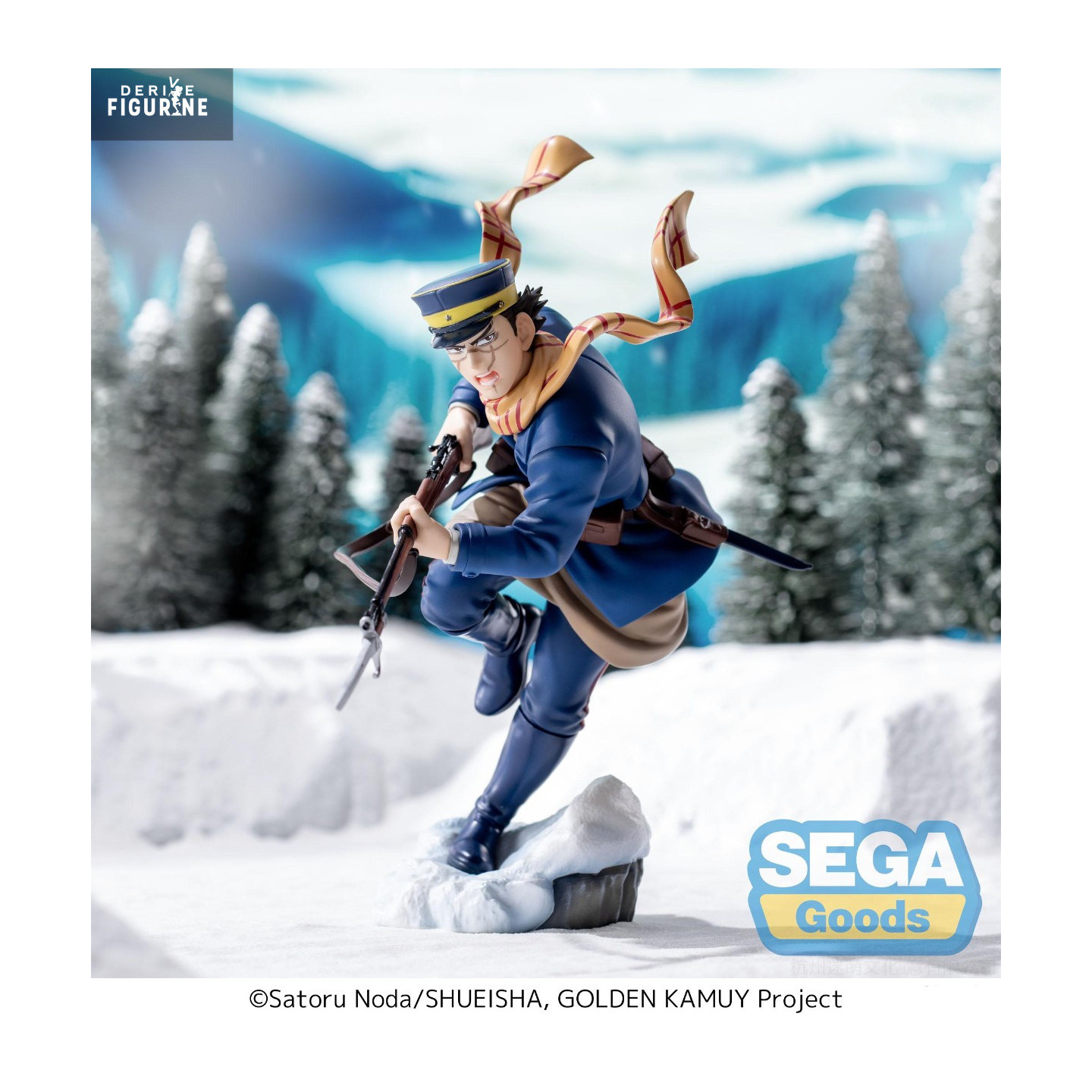 The design stays true to the original: blue military uniform, gear belt, rugged boots, and finely detailed rifle. Every element—from his focused expression to the texture of his coat—reflects the harsh and grounded world of Golden Kamuy. He stands atop a snow-covered base, anchoring him in the icy terrain.