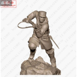 The prototype highlights impressive sculpting detail: his military coat rippling with motion, sturdy boots, sword sheathed at his side, and a taut rope in hand—symbolizing his control and discipline. The rocky base grounds the pose in a rugged setting reminiscent of Hokkaido’s harsh battlefields.