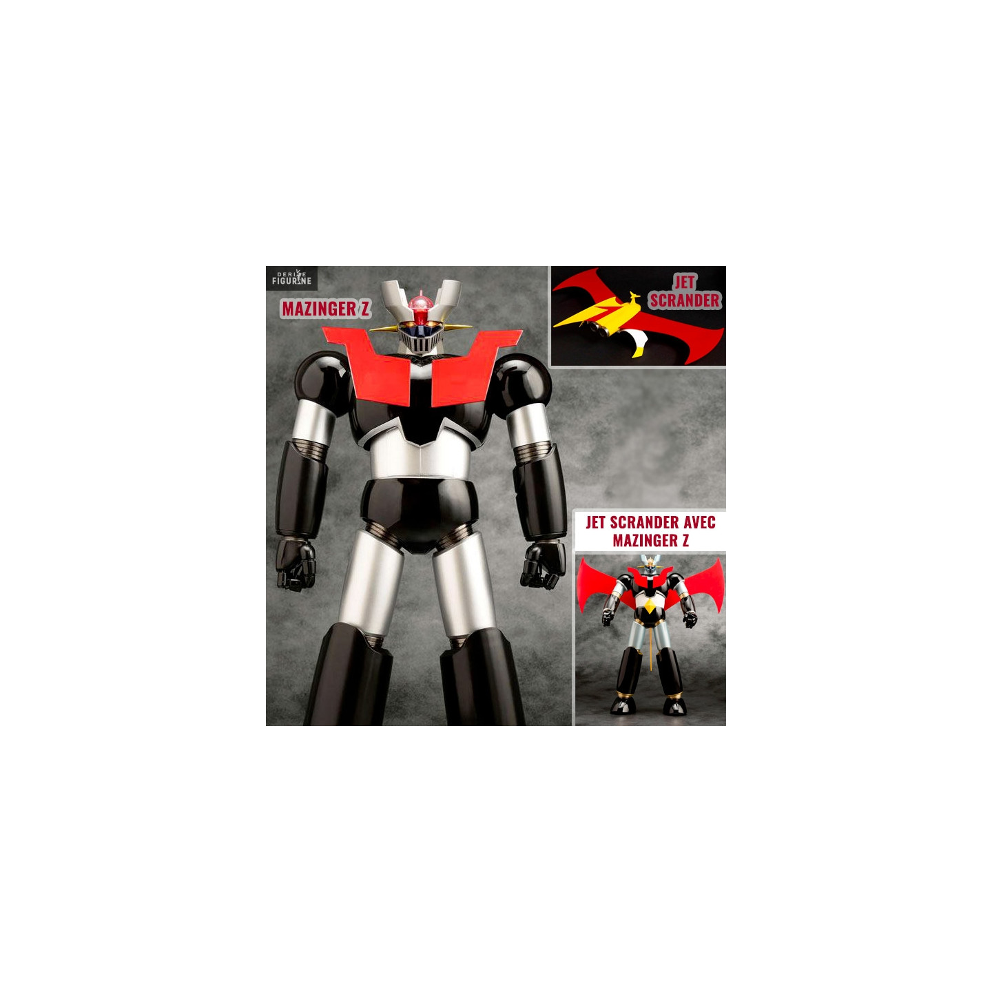 Official figure of your choice of Mazinger Z or accessory Jet Scrander in metal/PVC which measures about 40 centimeters high. The manufacturer is Evolution Toy.