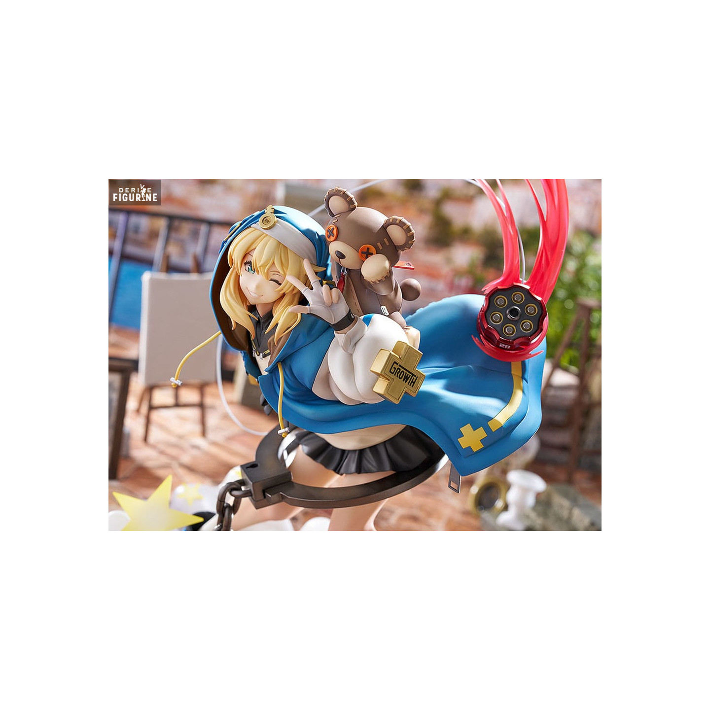 The paint work is exceptional, with bright colors and subtle shading that highlight the folds of his clothing and the textures of the different materials. The movement effects are superbly rendered, notably thanks to the fluid lines and minute details of his yo-yo in action. The base of the figure, decorated with clouds and stars, adds an extra dimension to the whole, evoking the fantasy universe of Guilty Gear Strive.