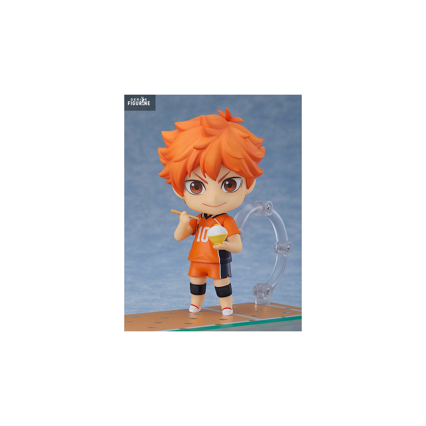 Each face plate—from the confident grin clutching a rice bowl with chopsticks, to the playful “slurp” expression, to the focused look catching a volleyball mid-air—adds a playful, lifelike touch. The figure stands on a base reproducing the gym floor and includes a clear support arm to simulate an airborne smash.