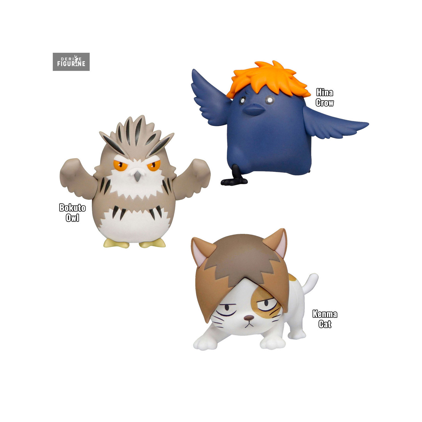 Official figure of your choice of Bokuto Owl (5 cm), Hina Crow (7 cm) or Kenma Cat (7 cm) in PVC. It is from the Noodle Stopper Petit collection. The manufacturer is FuRyu.