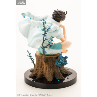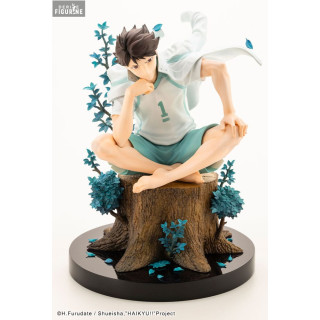 Seated on a tree stump surrounded by delicately sculpted blue-tinted leaves, Oikawa wears his iconic Aoba Johsai uniform, proudly bearing the number 1. His thoughtful pose and determined gaze reflect both his leadership and competitive spirit. From his neatly styled hair to the texture of the wood and leaves, every detail showcases the meticulous craftsmanship of Kotobukiya.