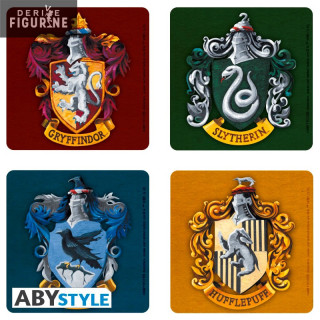Coasters Harry Potter representing the emblems of four houses which measures approximately 9.5 centimeters high. The underside is made of cork. The manufacturer is ABYstyle.
