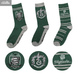 Each pair features a unique design: one with the classic serpent crest, one with a stylized house emblem, and one with stripes and the word "Slytherin" alongside the house symbol. The dark green and grey tones are a perfect match for Slytherin’s traditional colors — bold but refined.