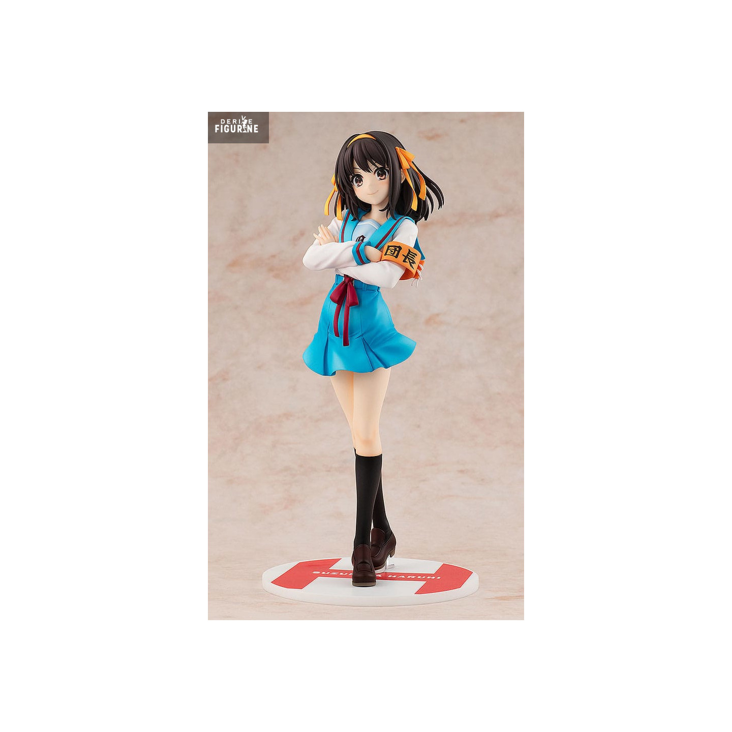 The Light Novel Edition PVC figure of Haruhi Suzumiya by Kadokawa captures the exuberant heroine in a confident pose, arms crossed and a determined gaze. Cast in PVC at a 1/7 scale for a height of around 23 cm, she wears her iconic school uniform—turquoise skirt, white blouse, and red sash—complete with the distinctive SOS Brigade armband.