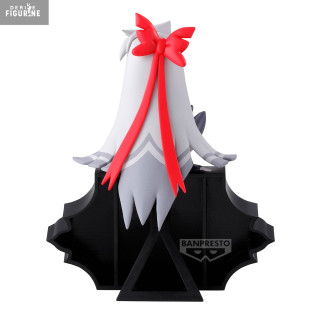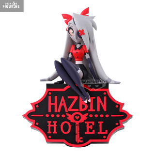 This roughly 14 cm PVC figure shows Vaggie seated with crossed legs and one hand placed behind her for perfect balance. Her vivid red blouse contrasts sharply with the dark “Hazbin Hotel” base, whose clean lines and embossed lettering add a striking graphic flair. The smooth, sculpted silver strands of her hair frame her angular face, highlighting her poised yet resolute demeanor.