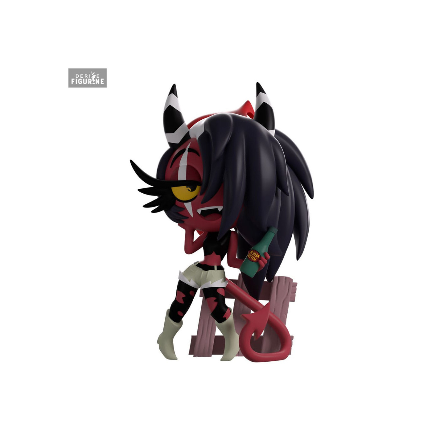 This vinyl figure faithfully captures her dynamic silhouette: black-and-white striped horns, voluminous curls, and a relaxed stance leaning against a stylized fence. Her black tank top, worn shorts, and pointed boots are hand-painted with a mix of matte and gloss finishes, emphasizing the contrasts of her demonic-western world.