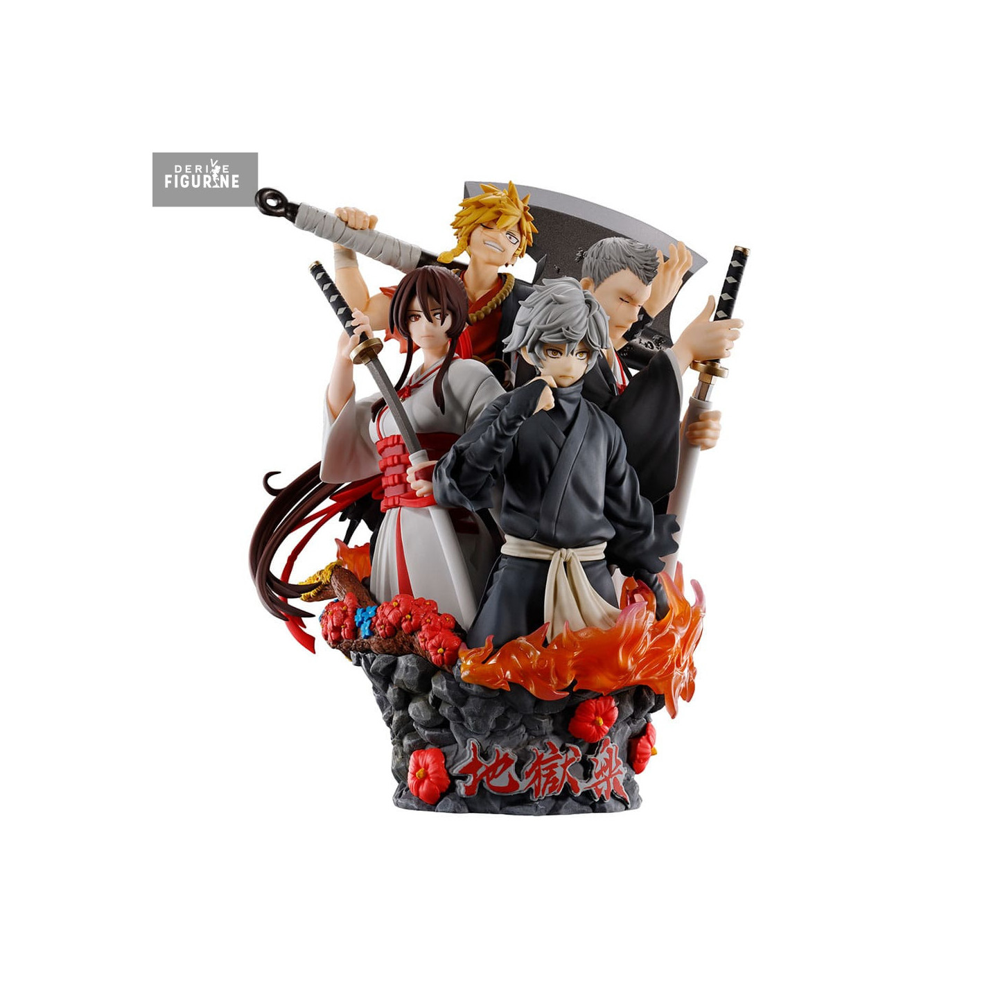 The design faithfully recreates their combat-ready stances and determined expressions. Clothing details – from Gabimaru’s understated black to Sagiri’s pure white accented with vivid red – are enhanced by a dramatic base adorned with sculpted flames and textured rocks, featuring the series title in bold red.