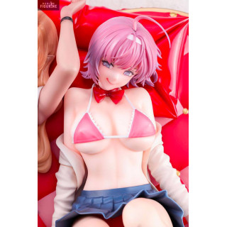 Two charming young women on a love hotel style heart-shaped bed, they answer to the sweet names of Anna and Megumi. They are dressed in very light outfits, one in an unbuttoned shirt and black skirt with panther panties. The other in a schoolgirl's outfit with a jersey for the top and red panties as an undergarment. Both seductive, they can undress at your convenience for a little more sensuality. They also come with play accessories...did you notice that one of the two has multiple moles?