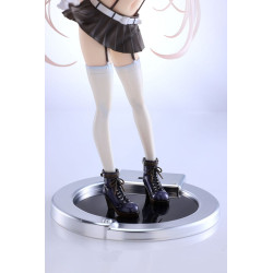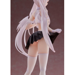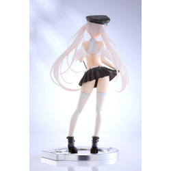 She’s sculpted standing on a round silver base, hips slightly shifted, one hand near the waist pulling a thin black ribbon while the other is raised to the side. She wears a black cap with a light emblem, a small black tie, and a very minimal white outfit accented by vertical black straps. Her white hair is extremely long, flowing out in wide, wavy strands around her, with pinkish eyes. She also has a pleated black skirt, white thigh-high stockings with thin garter straps, and chunky lace-up black ankle boots; the wide base makes it easy to place on display.