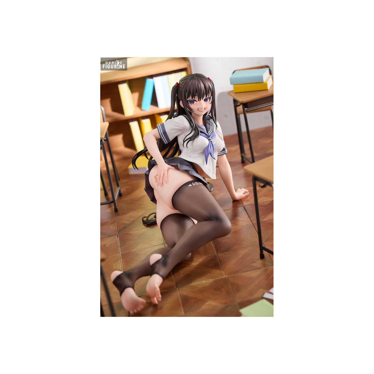 Iroha Shishikura is a popular student in this world where the thickness of a girl's thighs determines her social status. With her distinctive white hair, bright smile and confident attitude, Iroha perfectly embodies the concept of the series. This figurine depicts her in a seductive and relaxed pose, sitting on a classroom floor, lounging around with a playful look.