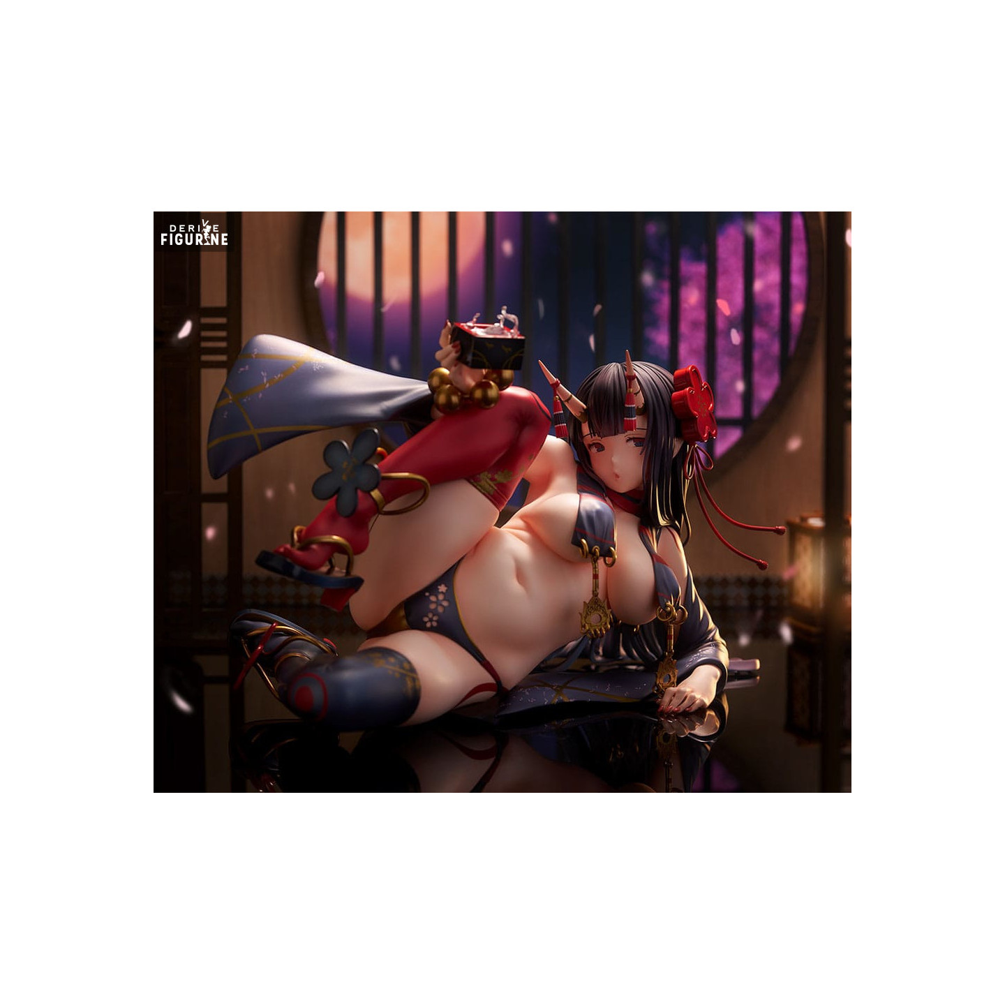 Her long black hair, adorned with red flowers and gold decorations, frames her delicate face and expressive eyes. The small horns on its forehead, typical of oni, add a touch of exoticism and accentuate its demonic origin. The details of her outfit, from delicate floral designs to sophisticated accessories, demonstrate painstaking attention to quality and realism.