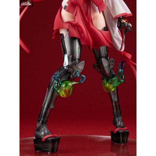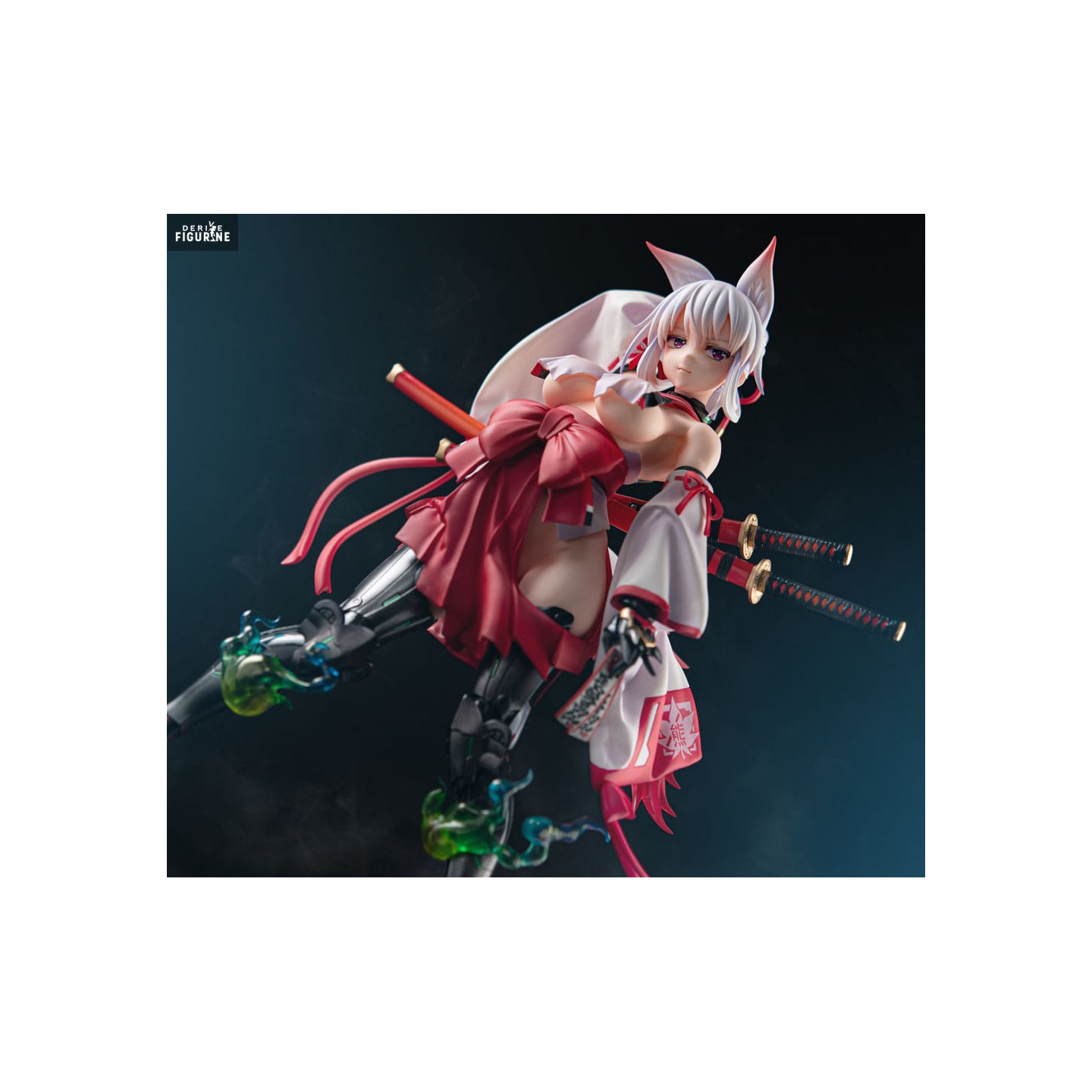 The details of the figurine are particularly careful. Agano's face, with its expressive eyes and delicately sculpted hair, immediately attracts attention. The outfit is rich in texture, with realistic folds and precise embellishments. The swords she carries add a touch of dynamism and reinforce her warrior appearance. In addition, the special effects depicting green flames around his cybernetic legs accentuate his powerful and mysterious character.