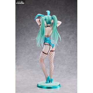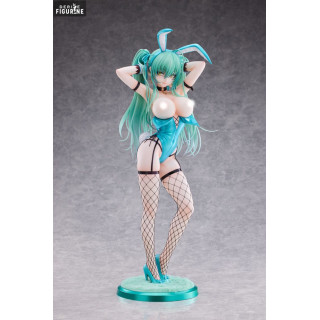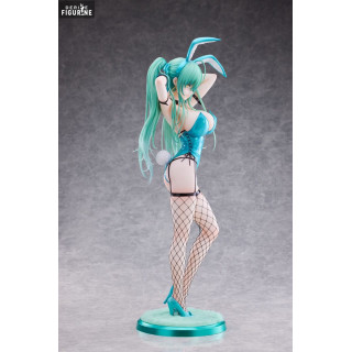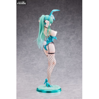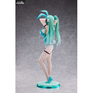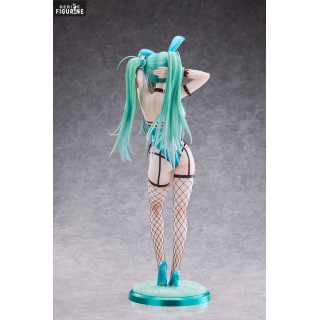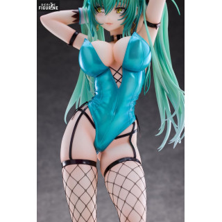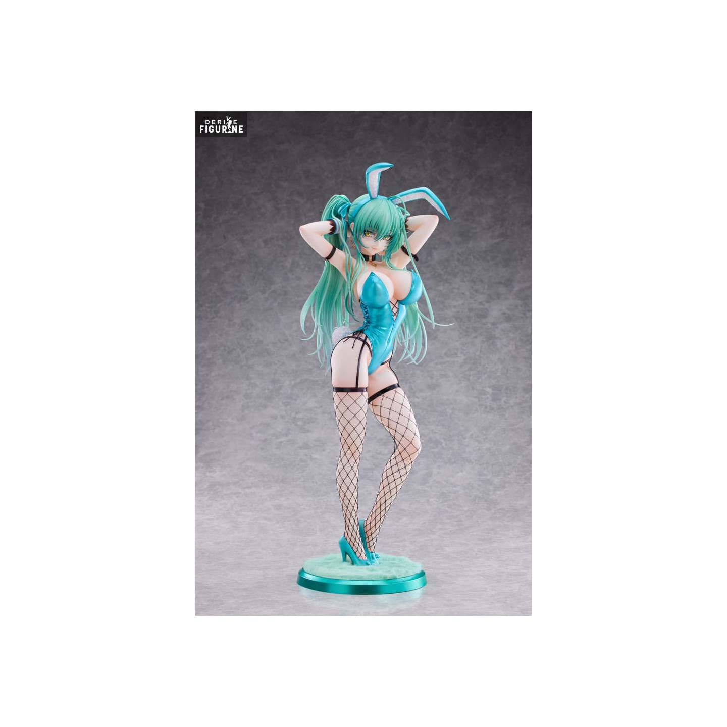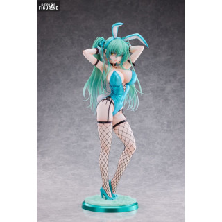 The Green Twin Tail Bunny-chan figure is a bold and stylish depiction of an original character dressed in a vibrant teal bunny costume, accented by black fishnet stockings that add a touch of glamor and sensuality. Her long locks of green hair, tied into two ponytails, gracefully frame her face, highlighting her piercing eyes and mischievous expression. The details of his costume, such as the bunny ears, bow tie and little bushy tail, are carefully sculpted and painted to create a realistic yet fantastical appearance.