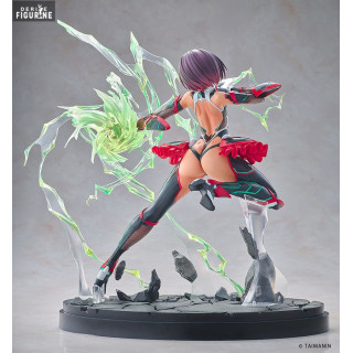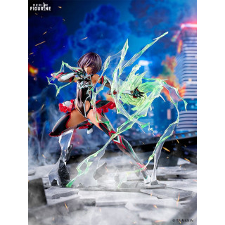 Yukikaze, one of the iconic heroines of the Taimanin universe, is renowned for her bravery, determination, and impressive combat skills. This figure highlights her futuristic battle outfit, blending black, red, and vibrant green fluorescent details with metallic accents for a striking contrast. Her detailed leggings and gloves emphasize her agility and strength, while the red frills on her outfit add an elegant and dynamic touch. The decorative base showcases a fractured terrain, enhancing the intense action vibe.