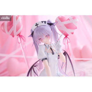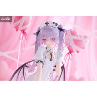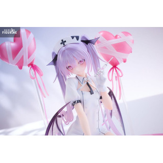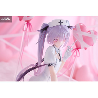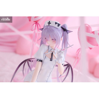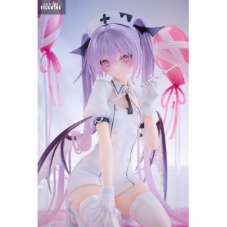 In a world where sweetness and mystery intertwine, Eve Sweet Toxic, designed by illustrator Rurudo, instantly captivates with her enchanting and subtly provocative appearance. This figure portrays her in a reimagined nurse outfit, as charming as it is enigmatic, playing on the contrasts between innocence and seduction. Eve's long lavender hair, delicately styled into flowing twin-tails, frames her face with an almost dreamy expression, while her hypnotic pink gaze seems to pierce the hearts of viewers. Holding a syringe with effortless elegance, she exudes a troubling softness heightened by the meticulously crafted accessories and intricate details.