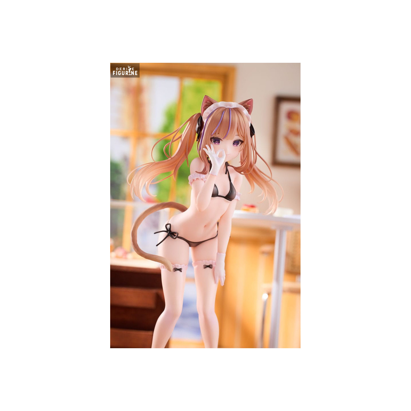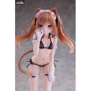 Mafuyu Leo, a character from an original universe, is elegantly portrayed in this refined figure that captures her delicate and unique charm. With feline traits, cat ears, and a long tail, Mafuyu Leo embodies a mysterious and captivating aura. This depiction highlights her light and elegant outfit, a black bikini adorned with small bows and subtle details that emphasize her sensual and graceful appearance. Her long blonde twin-tails and intense gaze add a touch of sophistication to the overall design.