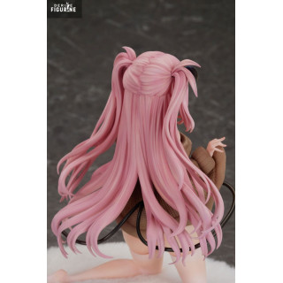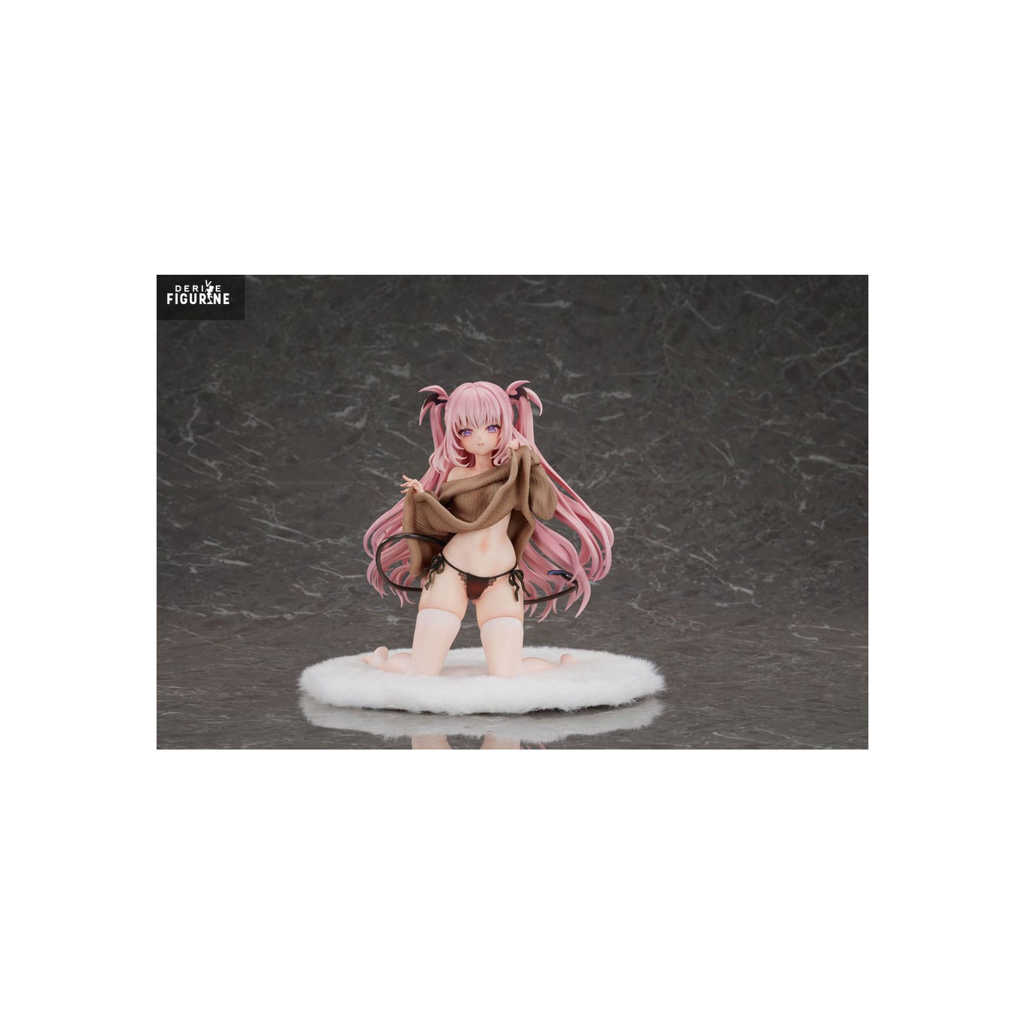 Lulumu is depicted standing, dressed in a loose brown knit sweater that is slightly lifted to reveal a delicate outfit beneath. Her long pink hair, adorned with flowing strands and small black horns, adds a playful and fantastical touch to her appearance. Her captivating violet eyes, highlighted by a mischievous and confident expression, immediately draw attention. The sculpt’s details, such as the realistic texture of the sweater and the subtle adornments of her outfit, reflect meticulous craftsmanship.