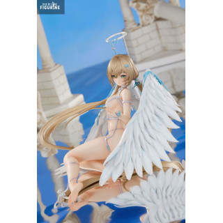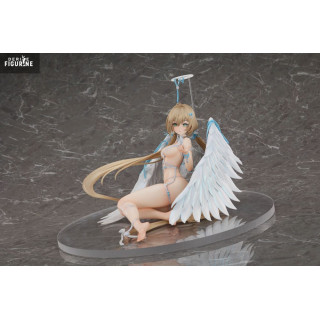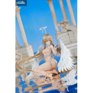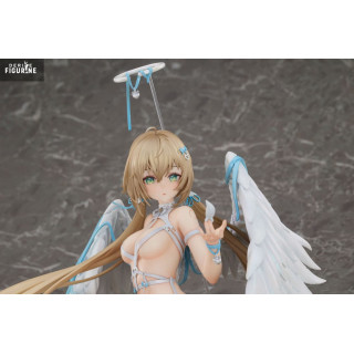 The figure depicts Momoko-Chan in a delicate kneeling pose, surrounded by majestic white wings. Her light outfit, adorned with light blue ribbons and subtle patterns, enhances her ethereal and poetic aura. The halo above her head adds a celestial touch, while her long blonde hair, meticulously sculpted, seems to gently float around her. Her soft and calming expression draws the eye, reinforcing the magical atmosphere of the scene.