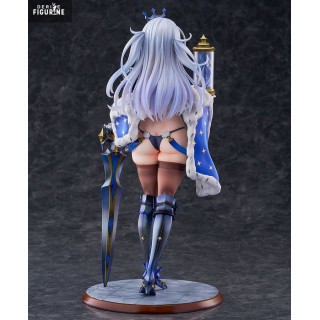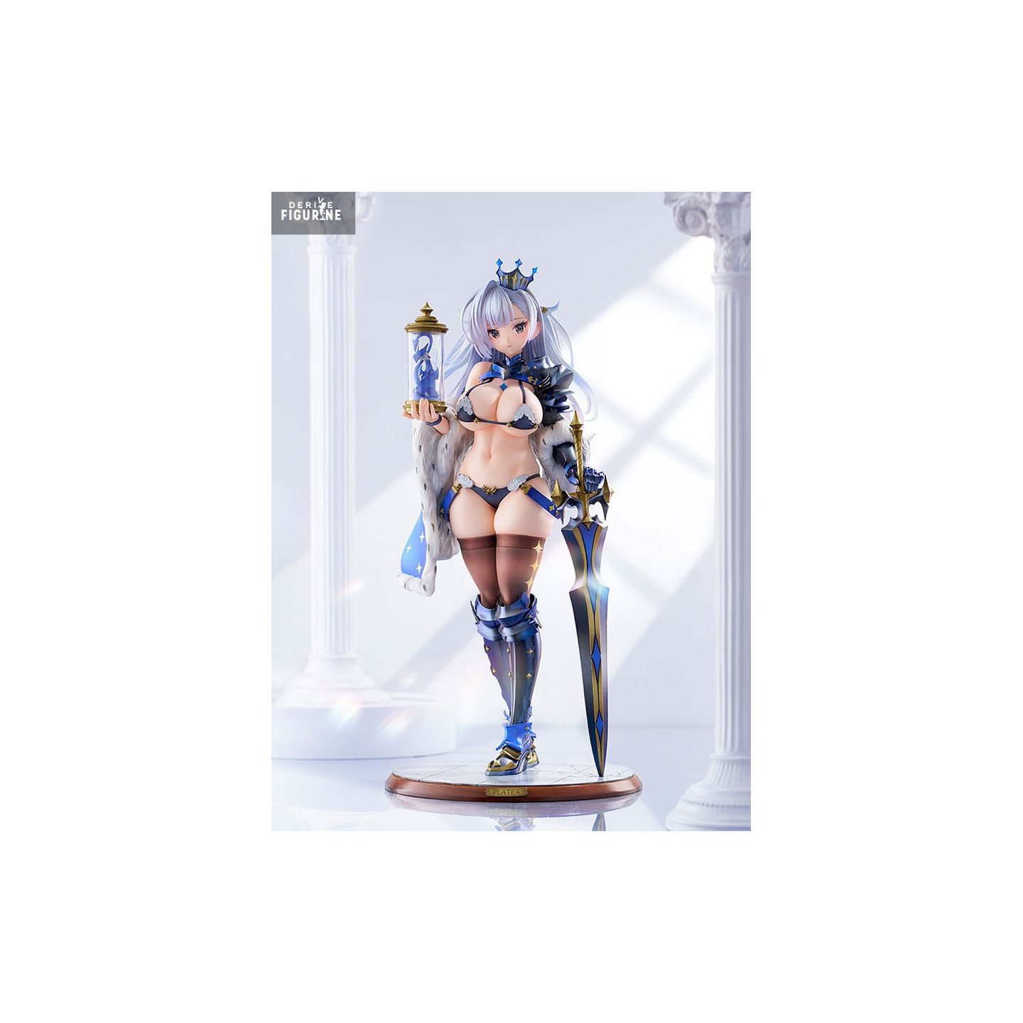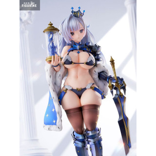 Her outfit is a daring combination of ornate armor and regal accessories—complete with crown, fur-draped shoulders, and a massive blue-accented sword. In her other hand, she holds a decorative hourglass, adding an air of mystique and strategy to her already imposing figure.