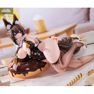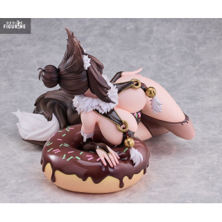 Measuring approximately 35 cm long by 20 cm wide, this large PVC figure captures Sumire lounging on her side, legs bent, hips raised, and a cheeky smile on her face. She wears a kimono-inspired outfit with floral patterns and dangling bells, paired with animal ears and a tail to emphasize her hybrid charm. The chocolate donut base adds a whimsical, sugary contrast to the sultry pose.
