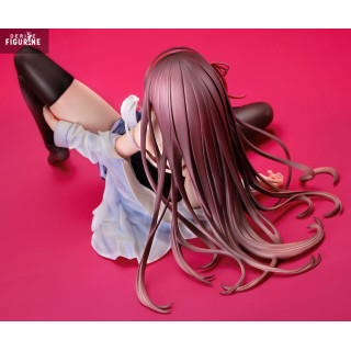 Misshitsu Shōjo, an original character by Kurehito Misaki, reclines in a bold pose that blends elegance and allure. Her intense gaze, framed by cascading brown locks, immediately captivates, while her exposed torso and shirt slipping off her shoulders highlight the sculpt’s anatomical precision. The lifted pleated skirt revealing delicate lingerie contrasts with the satin sheen of her thigh-high boots, lengthening her form.