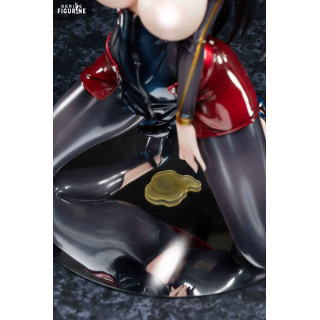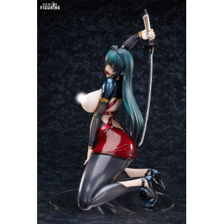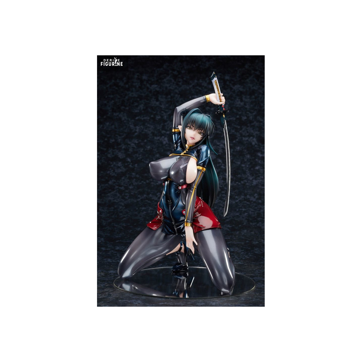 Clad in a form-fitting black suit with metallic sheens, she exudes quiet power: a partially unzipped bodice, asymmetric sleeves, and deep-red accents both flaunt her strengths and hint at her unpredictability. Posed in a kneeling slash stance—with one knee bent and her sword raised—the figure captures the precise moment where tension climaxes.
