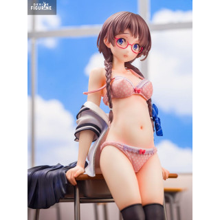 The sculpt faithfully reproduces her outfit details: beneath her jacket, Mei wears delicate pink lace lingerie that matches her ribbon and straps. Her dark thigh-high socks contrast with the pastel palette, while her rolled-up school slippers at the desk foot enhance the classroom setting. Her brown hair, styled in two soft braids, frames a face with finely painted features and a gentle blush on her cheeks.