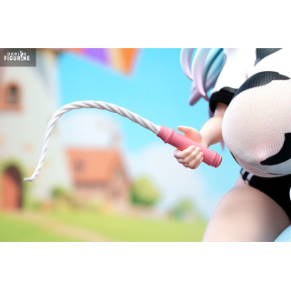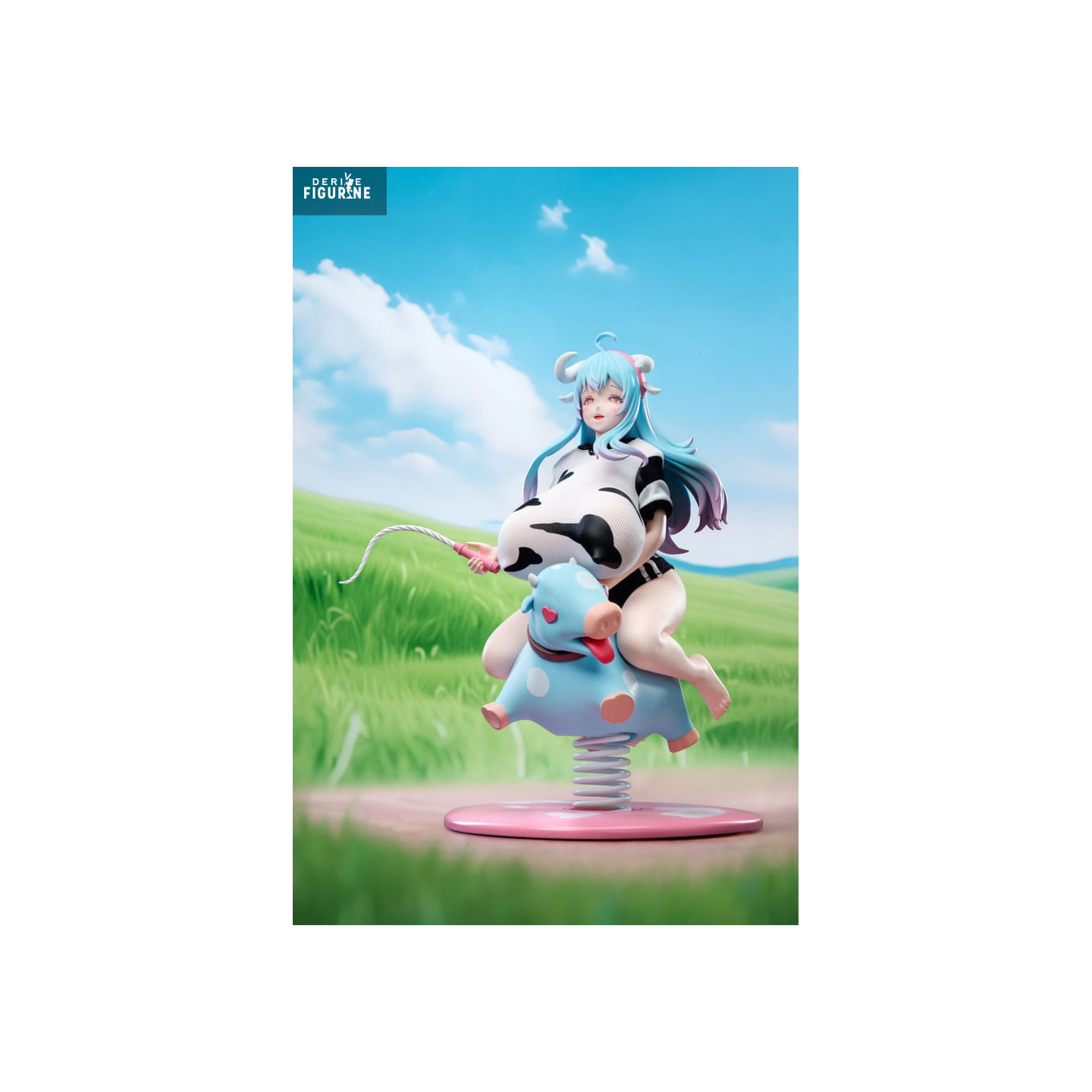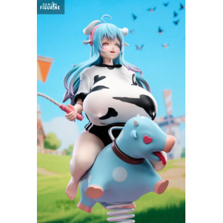 Seated on a spring-mounted cow toy, Niu Niang strikes a dreamy, relaxed pose. She wears a tight cow-print outfit with a horned headband, blending cosplay aesthetics with a twisted take on childhood playfulness. Her blue hair with lavender tips flows gently, enhancing her soft, full figure.
