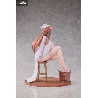 The figure depicts her in delicate white lingerie with lace detailing. A ribbon around her neck and a maid-style headband add to the intimate elegance. A light cape drapes from her shoulders to the floor, enhancing her relaxed posture. The foaming water bucket at her feet rests on a parquet-style base, adding realism to the scene.