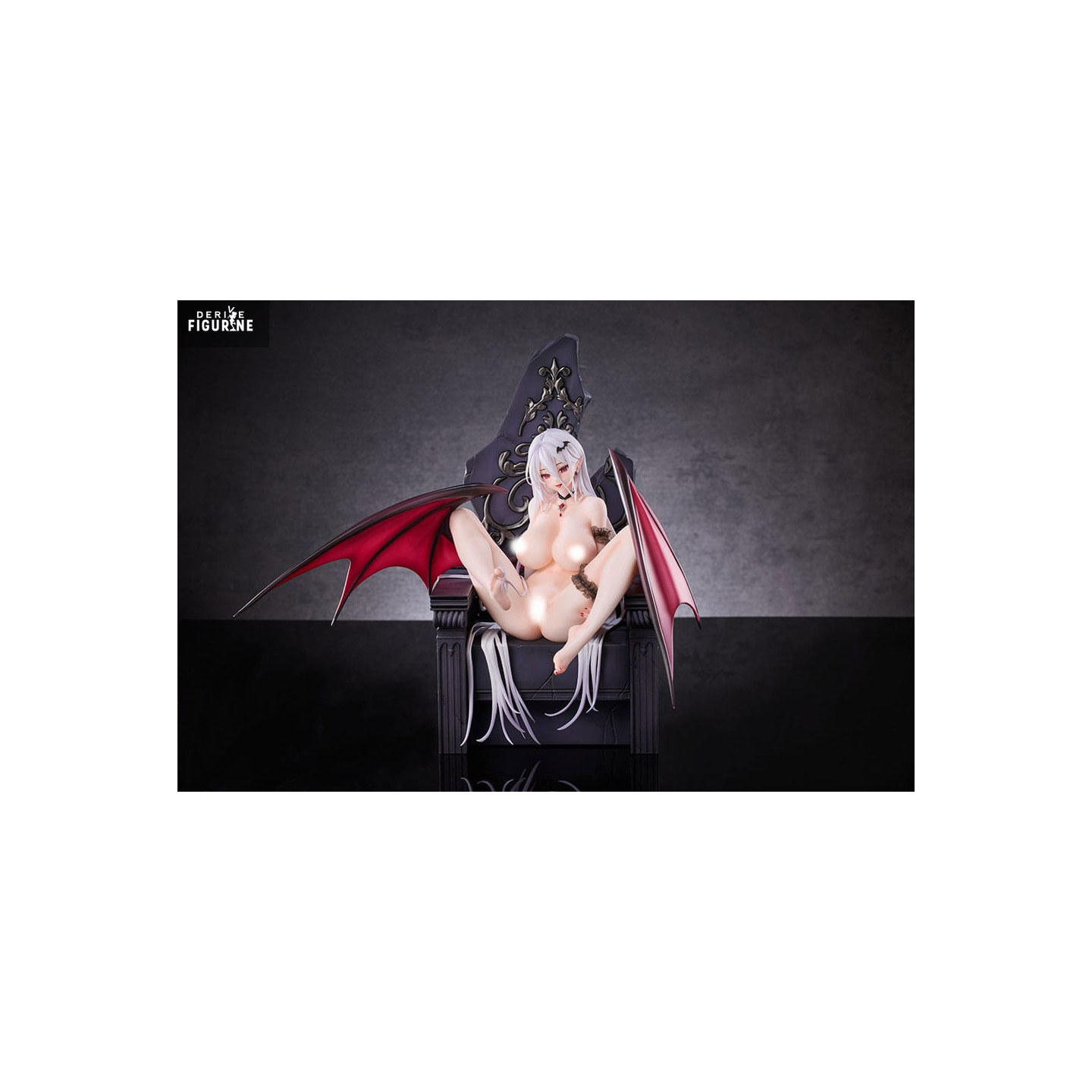 The figure depicts her nude, seated on a richly decorated baroque-style throne. Her crimson succubus wings extend outward, enhancing her demonic aura. Flowing silver hair frames her pale skin, while her red eyes and sly smile convey her seductive menace.