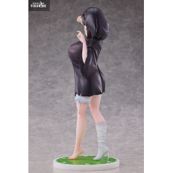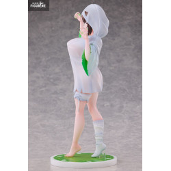 The PVC figure features Miru in a loose, semi-transparent hoodie with animal-style ears on the hood. The sheer fabric subtly reveals her curves. One leg is fully bare, the other covered with a long sock. She stands on a circular white-and-green base that echoes the hoodie’s inner lining. Her hands, shaped like playful cat paws, and her inviting smile bring personality and movement to the piece.