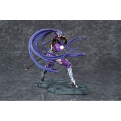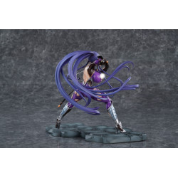 The design shows her in a tight purple bodysuit with large torn sections revealing patches of skin, broken up by black panels that emphasize her shape. Metallic silver armor parts cover her forearms, knees and heeled boots, underlining the combat-suit theme. Her very long purple hair is tied in a high ponytail and fans out behind her in dynamic strands. She wields a long black pole weapon, similar to a spear or naginata, held diagonally across the front of the figure so it becomes a central visual element. The base is sculpted like uneven stone paving in dark tones, creating a nice contrast with the bright colors of her outfit.