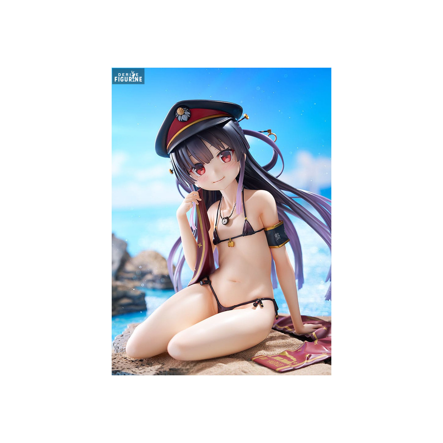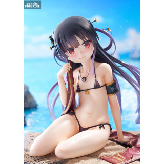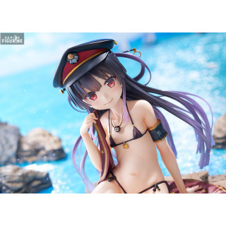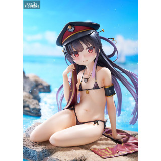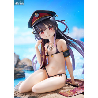 This Hachiroku - 1/7 Scale figure, crafted by Phat! Company, exquisitely captures the essence of the character. Standing 20 cm tall, it showcases a refined design and a delicate pose that highlights her natural charisma. Dressed in a minimalist black bikini, contrasted by a train conductor’s hat and an embroidered flag, she exudes both authority and allure. Her expressive red eyes and black-to-purple gradient hair create a striking contrast that enhances her beauty.
