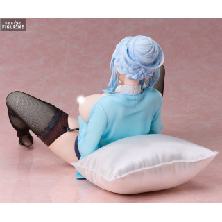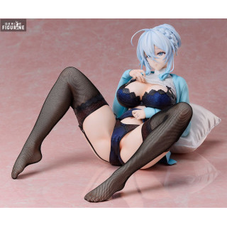 The Mifuyu Yukino - Casual Outfit figure, produced by BINDing, showcases a bold pose that highlights every detail of her refined design. Standing 20 cm tall at 1/4 scale, she wears a navy blue lace lingerie set, subtly draped in a light kimono that gracefully slips off her shoulders. Her finely textured black fishnet stockings add a touch of sophistication, beautifully contrasting with her fair skin and silver hair. The level of craftsmanship, from the delicately sculpted fabric to the harmonious curves of her figure, demonstrates exceptional artistry.