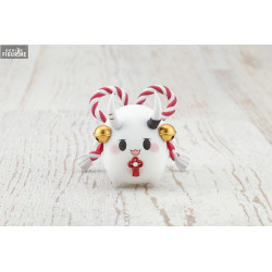 Her design features flowing sleeves with ribbons and tassel ornaments, a red kimono with delicate patterns, and long white hair tinted with pastel pink. Small horns rise from her forehead, and three translucent purple spirits float around her. Every texture is carefully crafted, from the folds of her outfit to the grain of the stone base.