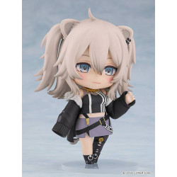 Everything is based strictly on what can be seen: silver twin-tail hair with stylized feline ears, a black and purple outfit with a tech-style top, mini-skirt, and a jacket slipping from her shoulder. Accessories include a detailed firearm, a small expressive gray pot, a food bowl, and night-vision goggles. The interchangeable faces range from composed to bright and cheerful. The standard clear Nendoroid base ensures stability.