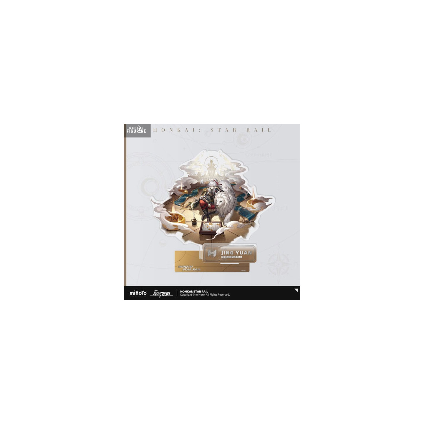This acrylic figure presents a still, symbolic scene. Jing Yuan sits in quiet focus before a game board, his majestic lion companion by his side. A golden, cloud-filled background and a temple silhouette elevate the sense of authority and serenity.