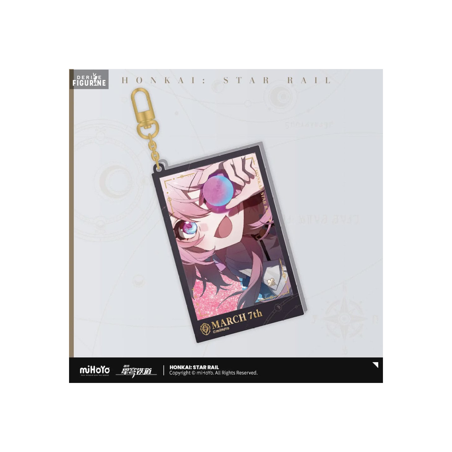 Official keychain of March 7th Glitter in acrylic with glitter which measures approximately 9 centimeters high. The manufacturer is MiHoYo.
