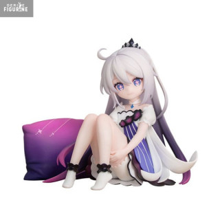 The design, true to the official artwork, depicts her seated on a star-speckled cushion with a purple-to-pink gradient, legs drawn in close. Her pristine outfit blends white, purple, and black accents: a structured bodice, a short skirt with flowing edges, short pauldrons, and a delicate collar. Her long white hair, tipped in lilac, frames her gentle face beneath a small dark tiara.