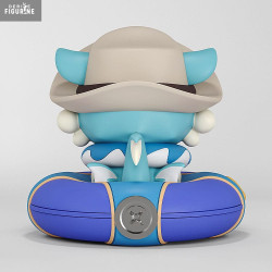 The design focuses on pure cuteness: clean lines, soft shapes, and unmistakable accessories — a blue-and-yellow float ring, bright yellow shades, and a wide beige sun hat. There are no articulation points, but the wide base keeps it stable on display.