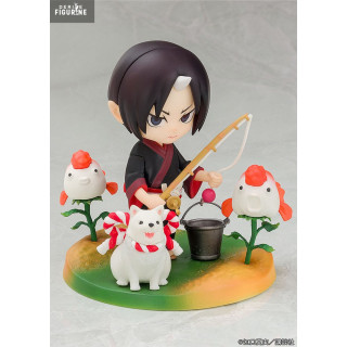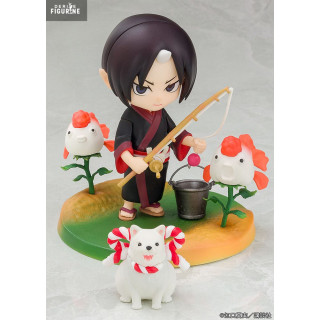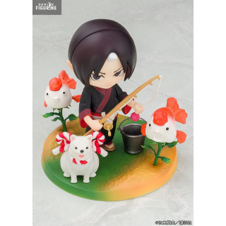 The figure captures a scene full of personality, with Hôzuki in a dark kimono accented with red details, holding a fishing rod as he prepares to catch a fish for a typical infernal activity. At his side, Shiro wears a festive red-and-white striped collar with a joyful smile. The setup is further enhanced by whimsical elements, such as a fish-faced flower and a metal bucket, adding a playful and quirky dimension to the composition.