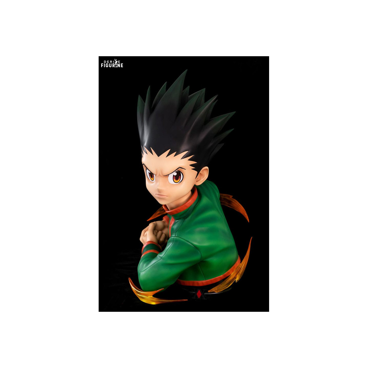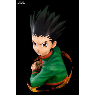 The bust is adorned with his recognizable green uniform, with touches of red at the collar and cuffs, faithfully reproduced from the anime. Paint and texture effects on the resin bring this piece to life, adding depth and character. The details of Gon's muscles and posture demonstrate his strength and determination.