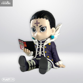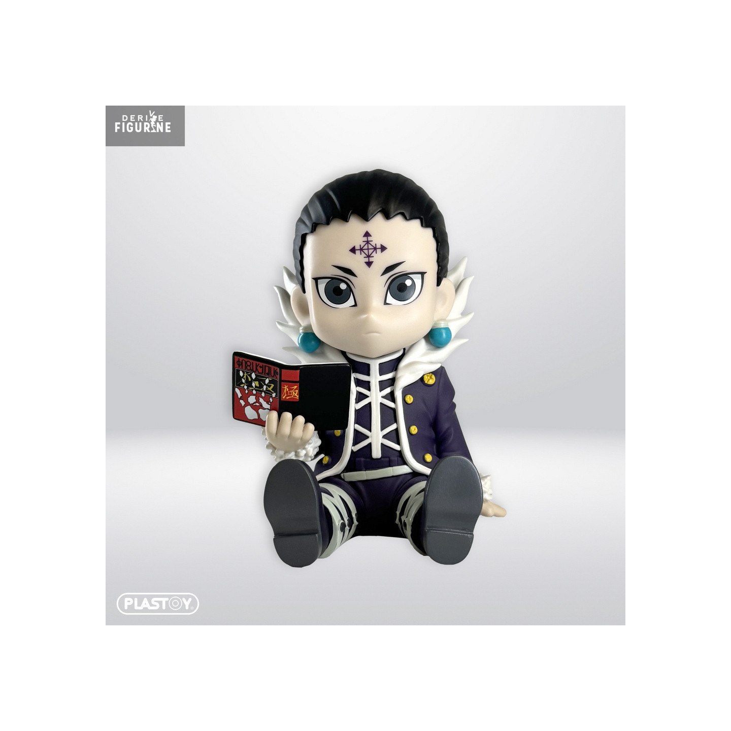 This coin bank figure shows him seated, holding a red-and-black book in his hand—an iconic accessory tied to his Nen abilities. His face bears a serious expression, and the cross-shaped tattoo on his forehead is faithfully reproduced. He wears his purple coat with gold buttons and a white feathered collar, along with his signature turquoise earrings.